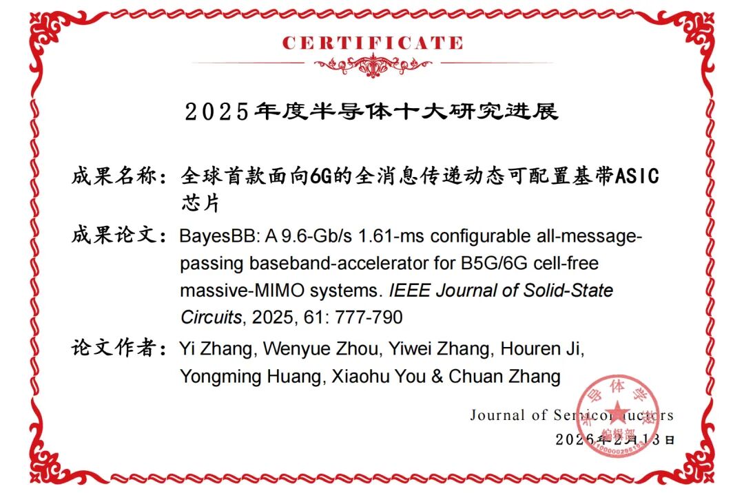 近日,東南大學(xué)信息科學(xué)與工程學(xué)院張川教授、尤肖虎院士團(tuán)隊(duì)正式收到2025年度“半導(dǎo)體十大研究進(jìn)展”獲獎(jiǎng)證書(shū),其聯(lián)合紫金山實(shí)驗(yàn)室研發(fā)的全球首款面向6G的“全消息傳遞動(dòng)態(tài)可配置基帶ASIC芯片”(BayesBB)憑借在6G核心硬件領(lǐng)域的突破性創(chuàng)新斬獲該項(xiàng)榮譽(yù)。