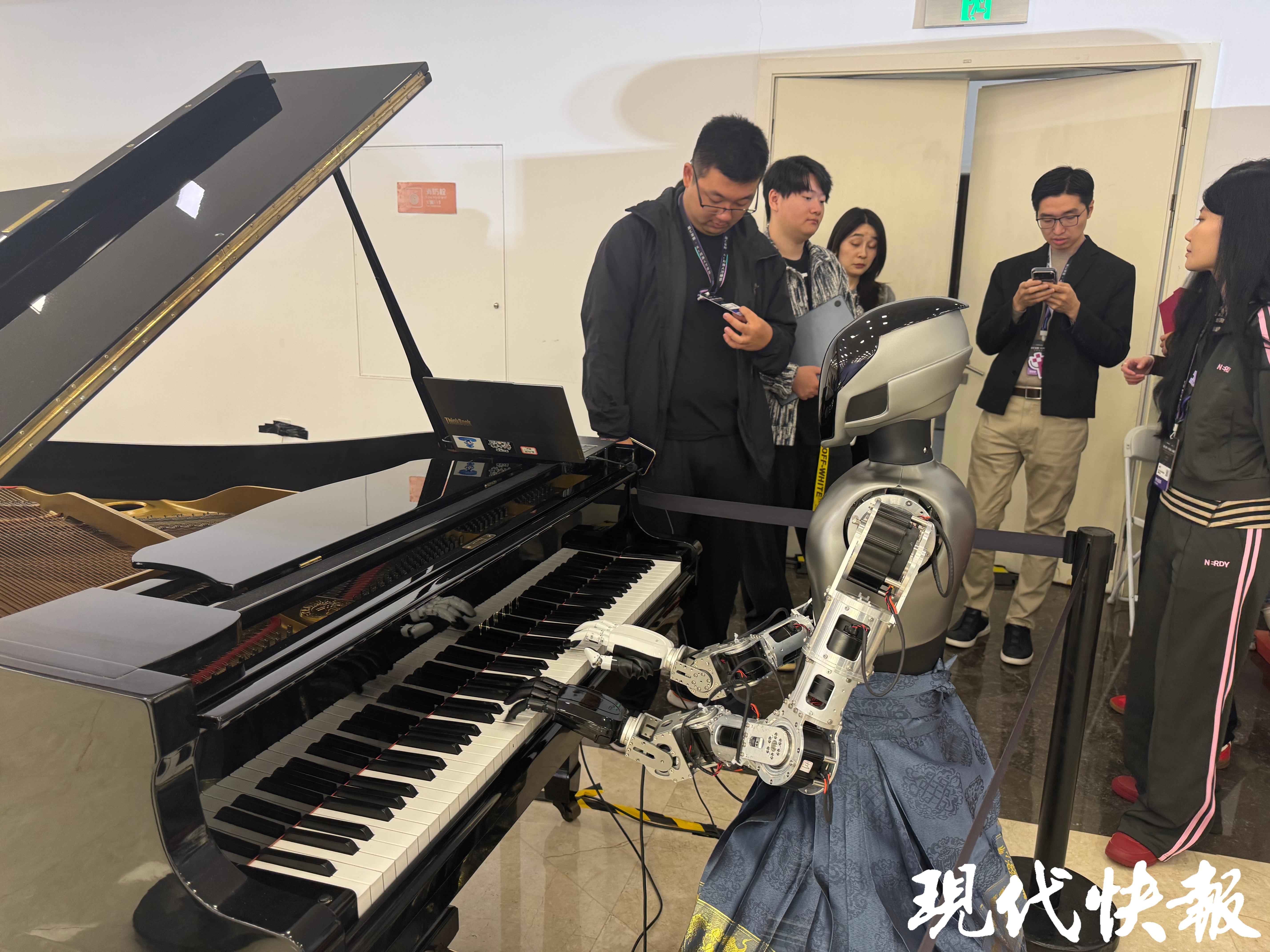 靈心巧手(上海)科技有限公司在現(xiàn)場(chǎng)展示的彈鋼琴機(jī)器人,吸引了不少觀(guān)眾駐足。南京一名六年級(jí)學(xué)生岳楊告訴現(xiàn)代快報(bào)記者:“我在春晚上看過(guò)機(jī)器人表演,今天在現(xiàn)場(chǎng)看到了很多機(jī)器人,很震撼。讓我印象最深的,就是會(huì)彈鋼琴的機(jī)器人?!膘`心巧手聯(lián)合創(chuàng)始人兼首席AI架構(gòu)師蘇洋在接受記者采訪(fǎng)時(shí)表示,靈心巧手研發(fā)的高靈巧機(jī)器人手可應(yīng)用于人形機(jī)器人、工業(yè)機(jī)械臂、康養(yǎng)按摩以及展館引導(dǎo)等多類(lèi)場(chǎng)景。該產(chǎn)品自重約370克,在靜態(tài)承載能力方面表現(xiàn)突出,單手可實(shí)現(xiàn)較高負(fù)(50kg)載懸掛。末端執(zhí)行器越輕,通常越有利于提升控制精度、響應(yīng)速度和系統(tǒng)安全性。蘇洋介紹,目前團(tuán)隊(duì)已將靈巧手應(yīng)用于鋼琴演奏等復(fù)雜操作任務(wù),機(jī)器人不僅能夠完成多指協(xié)同控制,還已實(shí)現(xiàn)四手聯(lián)彈,并可演奏《克羅地亞狂想曲》《野蜂飛舞》等對(duì)節(jié)奏、速度和指法要求較高的曲目。