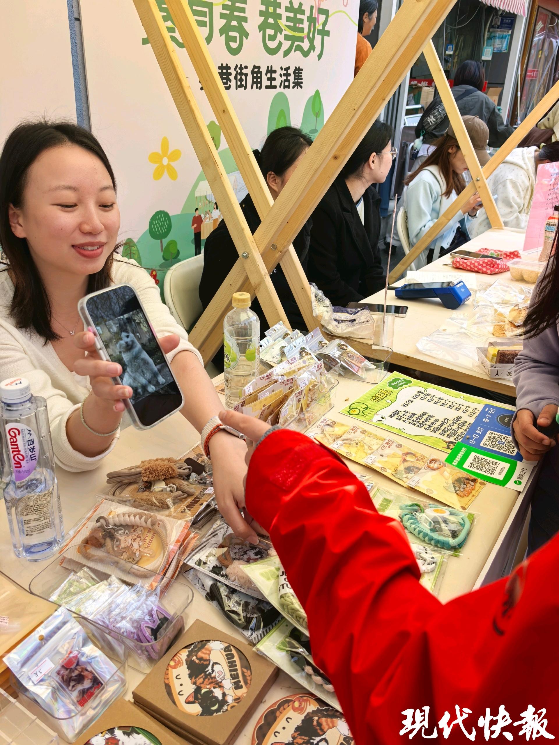 來(lái)自東南大學(xué)的學(xué)生攤主,更是市集里的亮眼存在。東大四牌樓校區(qū)貓咪保護(hù)協(xié)會(huì)的攤位前人氣爆棚,志愿者馬怡寧帶著印有手繪校園貓咪的手機(jī)繩、杯墊等文創(chuàng)產(chǎn)品亮相,這些為校園流浪貓籌備的公益好物,不僅收到周邊居民的鼎力支持,更讓小朋友們挪不開(kāi)腳,大家紛紛購(gòu)買(mǎi)為流浪貓助力。