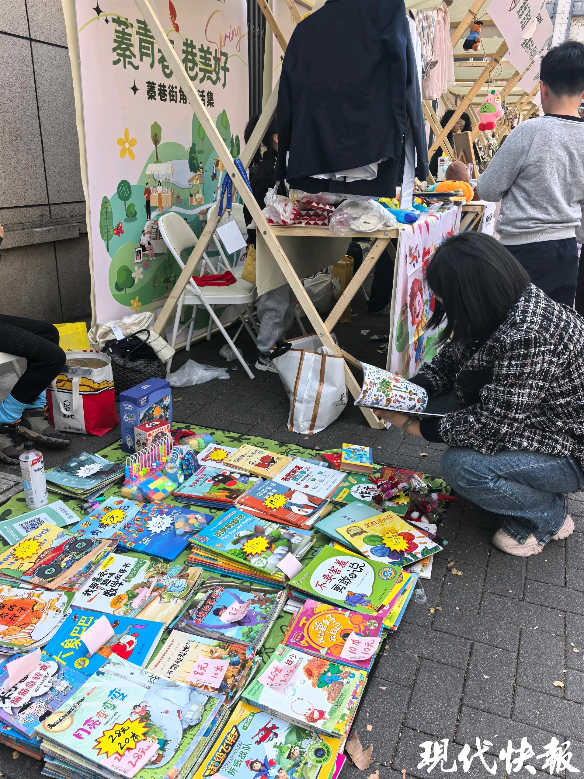 市集一角,來(lái)自成賢街社區(qū)的義賣(mài)區(qū)堪稱(chēng)小朋友的快樂(lè)天地,繪本、玩偶、文具擺滿(mǎn)攤位,寶媽寶爸帶著孩子挑挑選選,熱鬧非凡。同為一年級(jí)的小姐妹高雨萌、張欣詞組團(tuán)擺攤,不到一天的時(shí)間就收獲滿(mǎn)滿(mǎn),“昨天晚上,我找了4個(gè)玩偶還有4個(gè)卷筆刀,剛剛賣(mài)了一個(gè)蛋仔玩偶?!币粋?cè)攤位上最熱銷(xiāo)的是繪本?!拔覀冋砹艘恍┻m合低幼年齡段的繪本,價(jià)格都很便宜,不少是新手爸媽給孩子買(mǎi),還遇到個(gè)學(xué)生給她的外甥女買(mǎi)的?!睌偽灰慌缘膶殝尭嬖V記者。